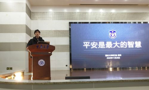 于重庆大学虎溪校区一食堂小剧场成功举办“平安是最大的智慧”主题讲座。本次讲座由学校保卫处雷泽老师担任主讲人,学办主任兼19级辅导员王丽娟主持,20级辅导员李珊珊及18、19、20级全体同学准时到场参加了本次讲座。