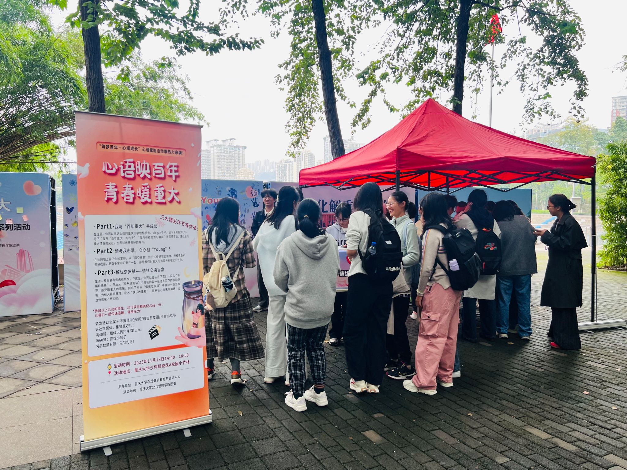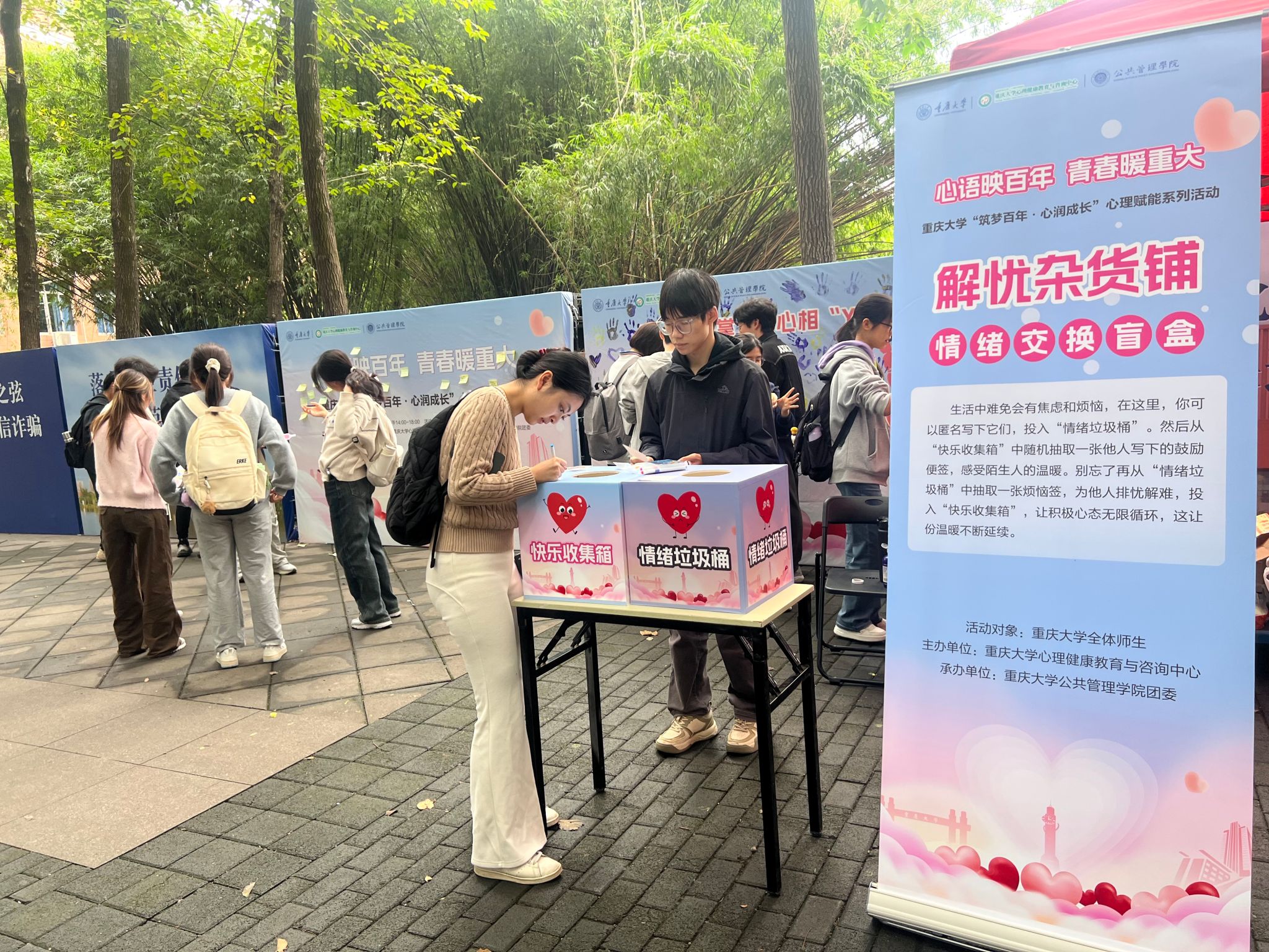 团委承办的“心语映百年,青春暖重大”心理赋能活动在沙坪坝校区A校园小竹林顺利举行。活动吸引了全校学生的积极参与,反响热烈。