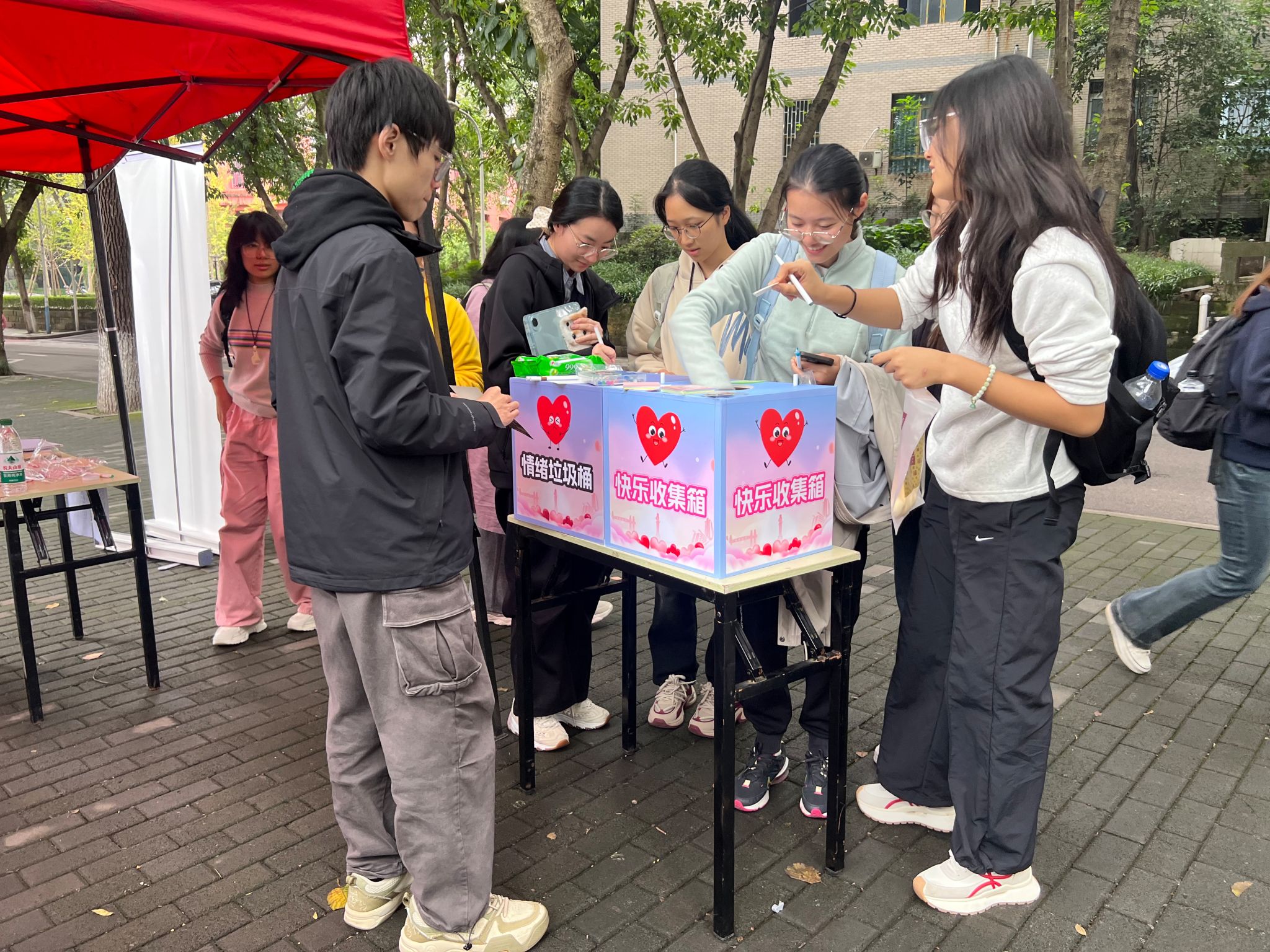 “解忧杂货铺——情绪交换盲盒”作为活动亮点,构建了一个安全、匿名的情绪倾诉与互助支持平台。参与者匿名写下烦恼投入“情绪垃圾桶”释放压力,再从“快乐收集箱”中抽取鼓励签汲取温暖;不少参与者还主动回应他人,抽取“烦恼便签”并写下温暖建议或鼓励话语反馈至收集箱,形成“倾诉—回应—支持”的良性互动闭环,有效传播了心理互助理念,营造出守望支持的积极校园心理氛围。