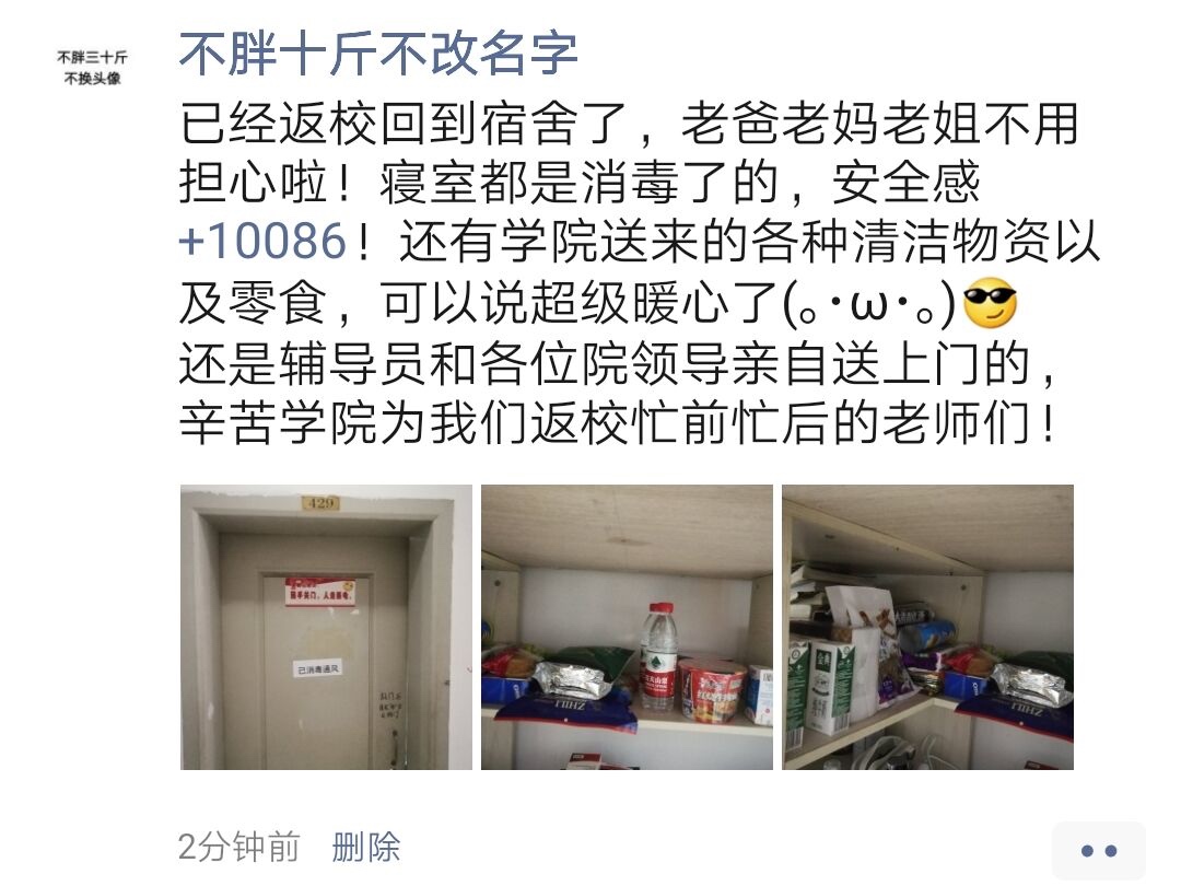 28日和29日下午,张玲书记、刘炳胜院长带队先后走访A区和虎溪校区学生宿舍,将学院准备的牛奶、水果、零食等慰问物资一一送到返校学生手中。在学生返校之前,学院已经将酒精、消毒液以及各种方便食品组成的“爱心包”准备好放在宿舍中,学生到达宿舍的第一时间即可领取。有的宿舍由于长时间无人居住、卫生状况堪忧,学院分管领导和辅导员从下午到凌晨,全力协调解决,确保全体学生顺利入住。一名返校同学说:“从到重庆一下车,到现在宿舍安顿好,时刻感受到学校、学院和老师们的关心关怀,真的很暖心!”