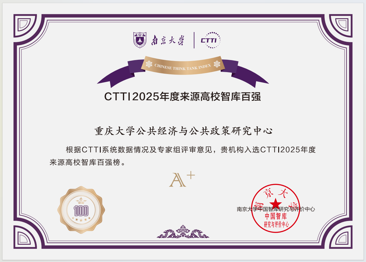 CTTI(中国智库索引)是由南京大学中国智库研究与评价中心联合光明日报智库研究与发布中心共同研发的智库数据管理与评价系统,是我国智库评价领域的权威平台之一。2025年度评选基于智库产品、智库活动、智库媒体影响等客观数据,并结合专家评审意见,最终从全国810家高校智库中遴选出综合表现最突出的100家。重庆大学公共经济与公共政策研究中心凭借其扎实的科研积累、丰富的政策咨询成果和良好的学术声誉脱颖而出,跻身顶尖高校智库行列。