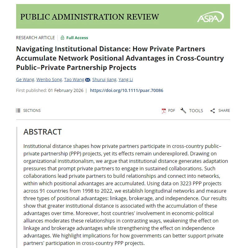 汪涛教授作为通讯作者、王歌副教授作为第一作者的研究成果“Navigating Institutional Distance: How Private Partners Accumulate Network Positional Advantages in Cross-Country Public–Private Partnership Projects”在公共管理学科顶级期刊Public Administration Review(PAR)在线发表。PAR由美国公共行政学会主办,创刊于1940年,以双月刊形式出版,在公共管理国际期刊中排名第一,是ABS 4*期刊。该文章由王歌副教授、博士研究生宋文勃、汪涛教授以及同济大学经济与管理学院的博士研究生江书睿和李洋合作完成,是在公共基础设施治理领域取得的又一项重要成果, 研究紧扣推动共建“一带一路”高质量发展与扩大高水平对外开放的国家战略需求,聚焦跨国基础设施合作的现实问题开展理论与实证探索。