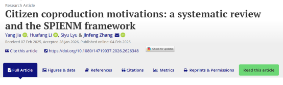 21级直博生贾杨作为第一作者、张金凤教授作为通讯作者的研究成果“Citizen coproduction motivations: a systematic review and the SPIENM framework”在公共管理学科顶尖期刊Public Management Review发表。该期刊在管理学类别中位于一区(Q1),影响因子在公共行政和公共政策领域SSCI期刊中位列前茅,是公共管理学科五大顶尖期刊之一,ABS 4星期刊。该文章由重庆大学博士研究生贾杨、匹兹堡大学李华芳教授和Siyu Lyu博士研究生、重庆大学张金凤教授合作完成,是合作生产行为研究领域的又一重要突破。
